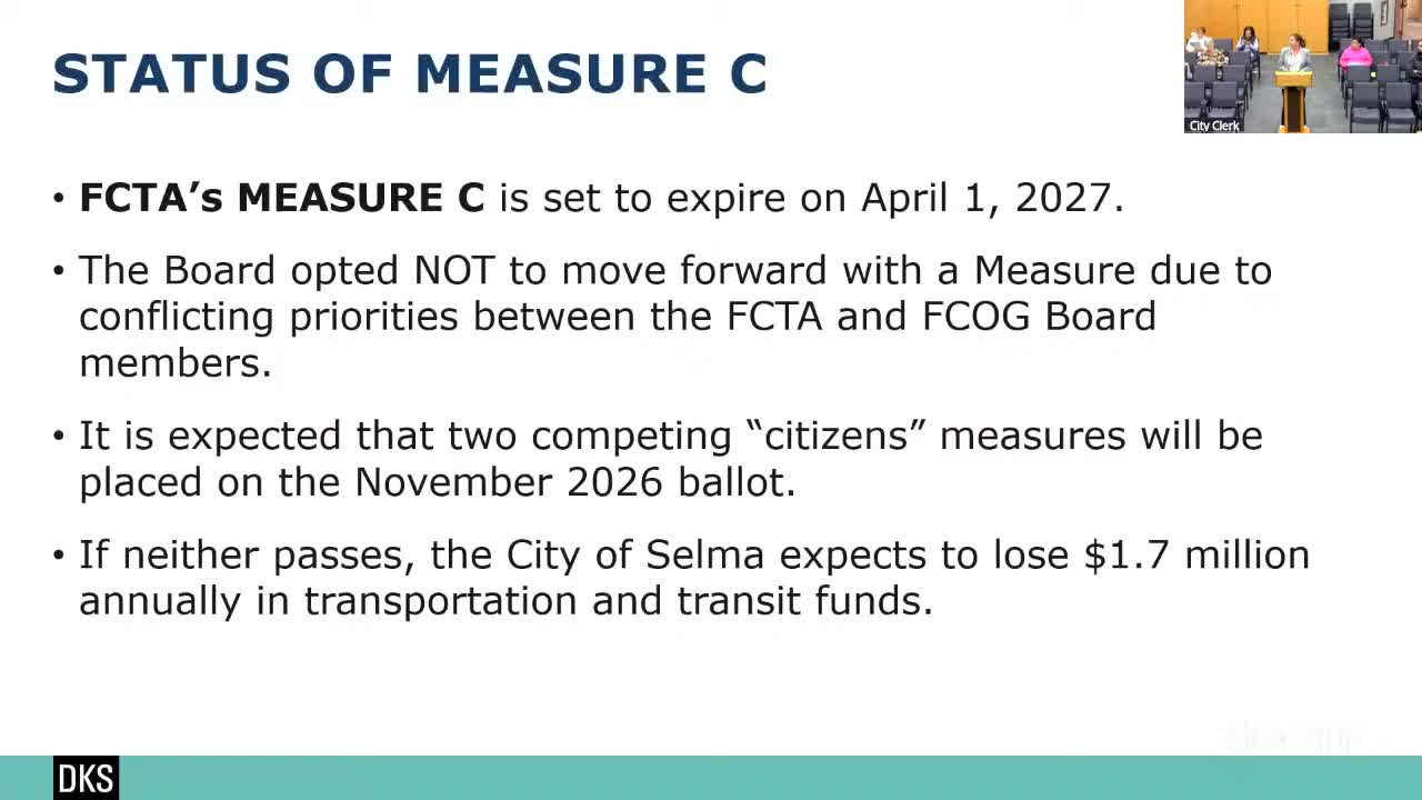 City staff and consultant DKS laid out options if Fresno County’s Measure C revenues lapse in 2027: a city half‑cent transportation tax, a three‑quarter‑cent general “quality of life” tax, or waiting on November’s county results and polling. Council favored monitoring and polling before acting.