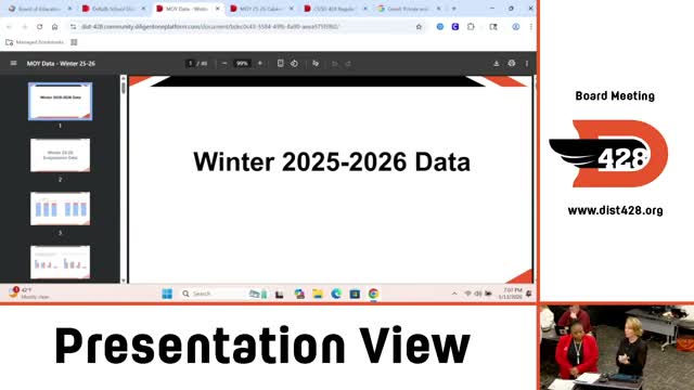 DeKalb CUSD 428 board members on Tuesday heard midyear academic data showing mixed gains across grades and persistent equity gaps in discipline.