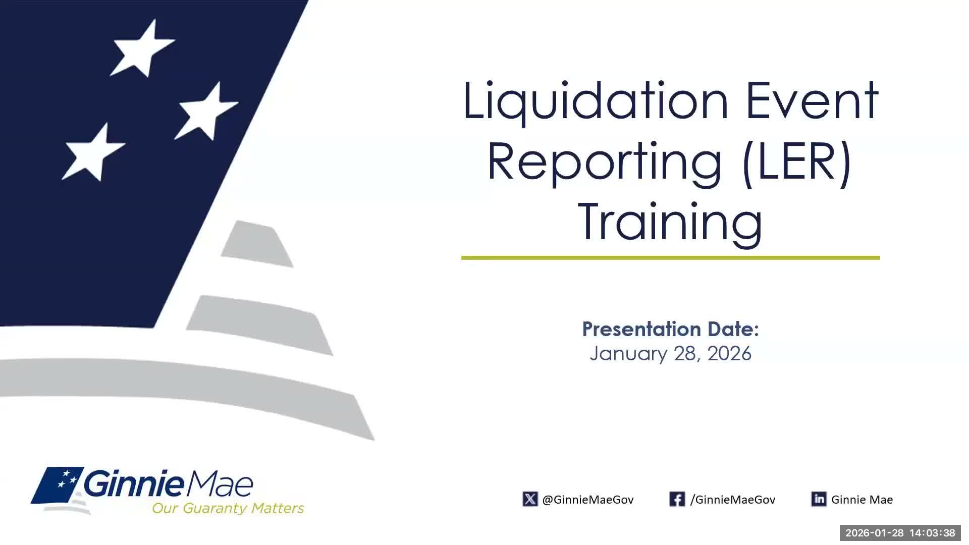 Ginnie Mae staff walked issuers and servicers through the new single-family liquidation-event reporting (LER) process, saying LER must be reported by 5 a.m. Eastern the next business day once an issuer has passed testing; testing remains open through Feb. 26.