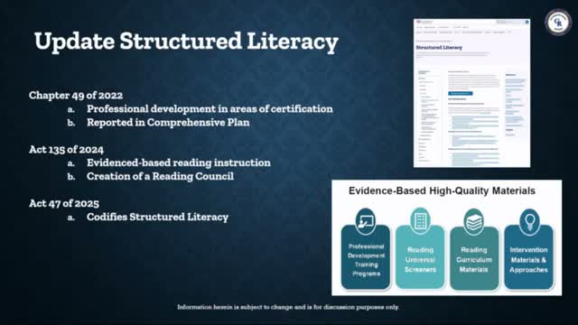 Tammy Garrett briefed the committee on structured literacy requirements that the district must follow under recent Pennsylvania actions. She cited Chapter 49 (2022) and Act 135 (2024), which clarify competencies and what the state considers evidence-based practice, and noted the Reading Council’s advisory lists of vetted programs. Garrett emphasized that while the state will collect data and set accountability timelines, "it's your decision as a district as to what you use" from the vetted lists and that districts must report program choices and professional development metrics to PDE.