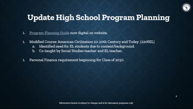 District staff showed a new digital high-school program planning guide published Jan. 1 and confirmed the state-required personal finance course will be a 0.5-credit graduation requirement for the class of 2030; implementation and scheduling details remain under development.