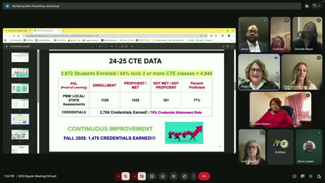 Board members asked how to publicize life‑saving skills — for example, CPR certifications earned in CTE — and staff agreed to share success stories. The board also discussed rescheduling an eighth‑grade elective showcase affected by weather.