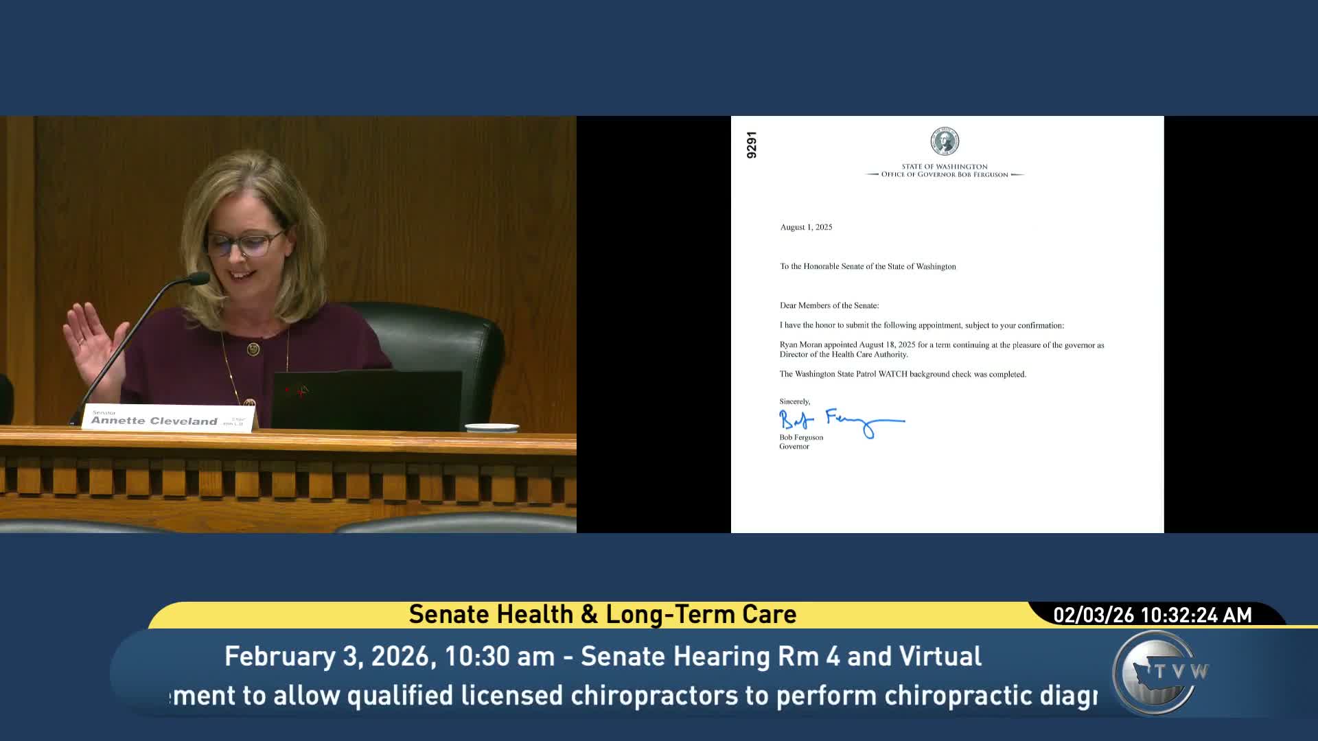 The Senate Health and Long Term Care Committee held confirmation hearings Feb. 3 for Ryan Moran, nominated as director of the Washington State Health Care Authority, and Dennis Worsham, nominated as Secretary of Health. Both nominees described priorities for coverage, behavioral health and rebuilding public trust; the committee reported both appointments with recommendations for confirmation.