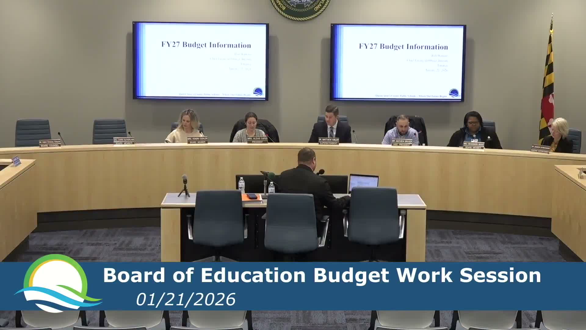 District staff told the board on Jan. 21 that the preliminary FY27 proposal would raise costs by 10.53% ($13.43 million), including $9.36 million to maintain current services and roughly $4 million for program restorations, while the Maryland state aid file needed to finalize revenues has not yet been published.