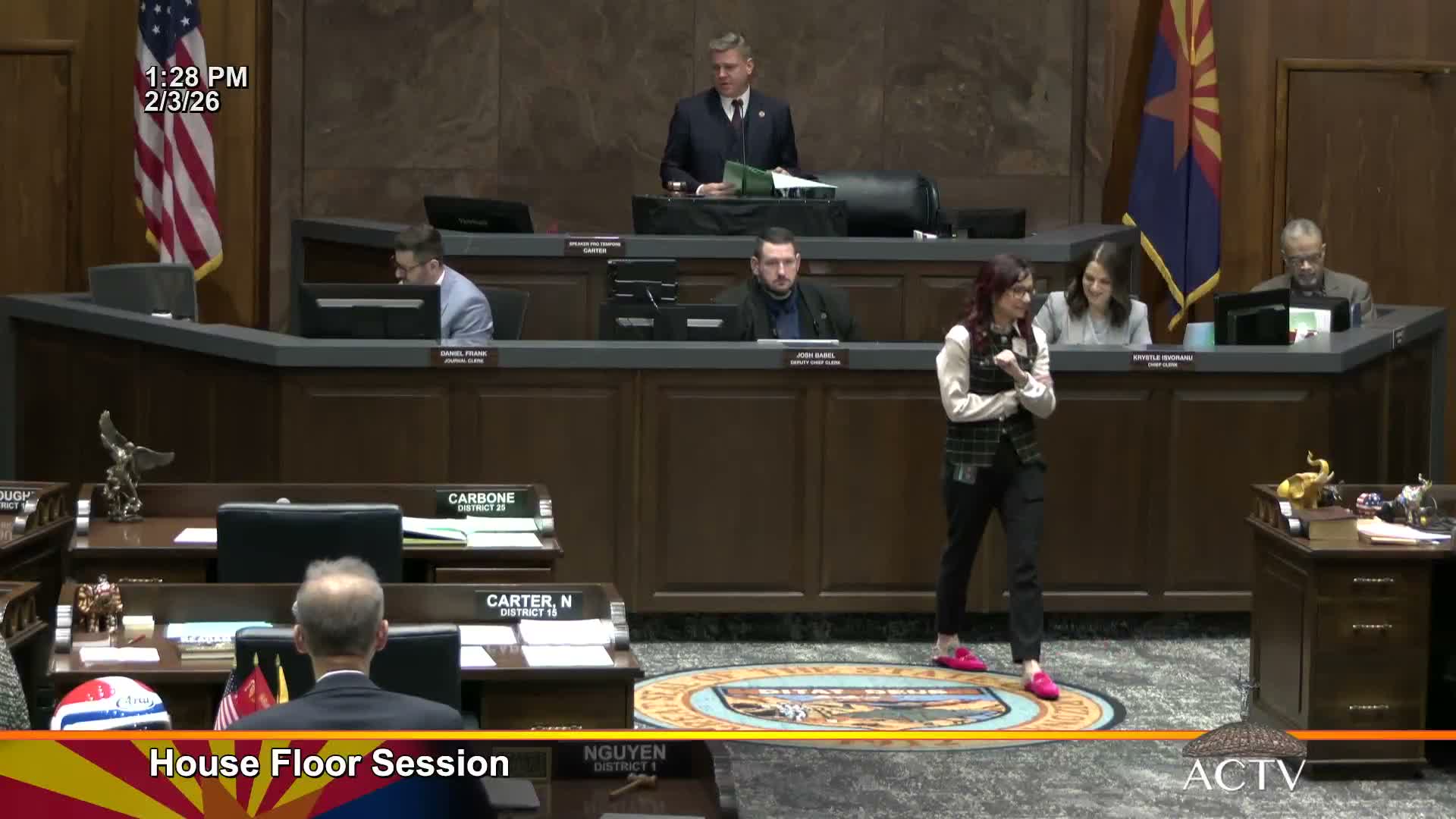 The Arizona House of Representatives convened on Feb. 3, 2026, passed several measures on third reading and adopted a Committee of the Whole report forwarding additional items to engrossing. The clerk announced roll‑call tallies as each vote concluded.