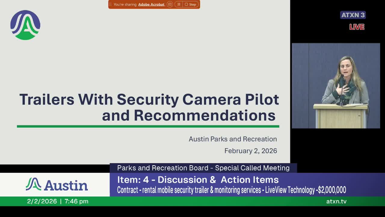 The Parks and Recreation Board considered staff’s recommendation to authorize negotiation and execution of a contract for mobile camera trailers and monitoring services but voted to reject the motion after extended public comment and board discussion.