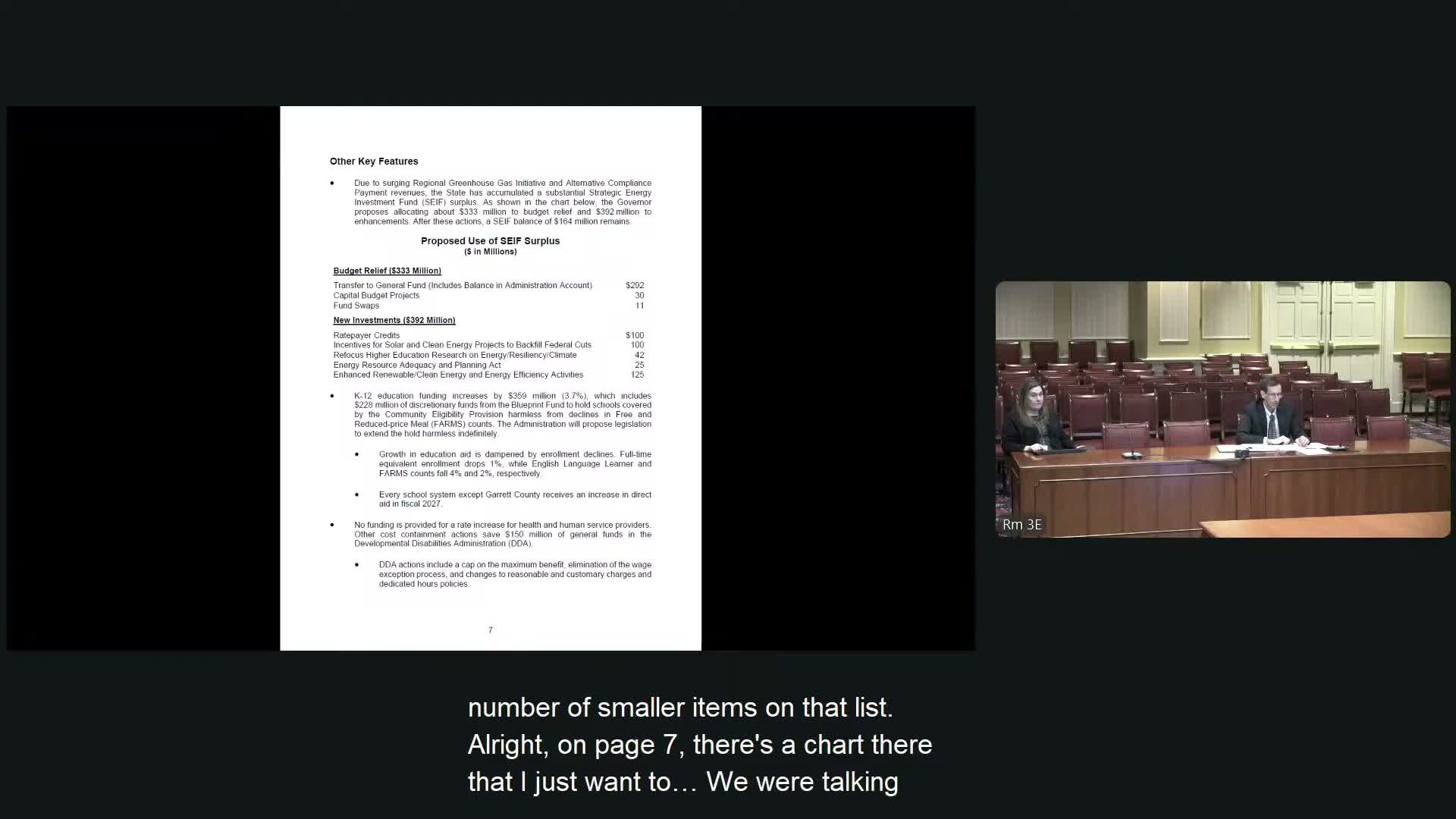 David Romans said the governor proposes using SEIF surplus to provide $333,000,000 in budget relief, $100,000,000 for ratepayer relief (a second round of credits following last session's program), and $100,000,000 for incentives including tax credits for solar and clean-energy projects. He said the fund also supports $42,000,000 in grants for higher-education research centers, with $25,000,000 proposed for the university system, $8.5 million for Morgan State University and $8.5 million for Johns Hopkins University.