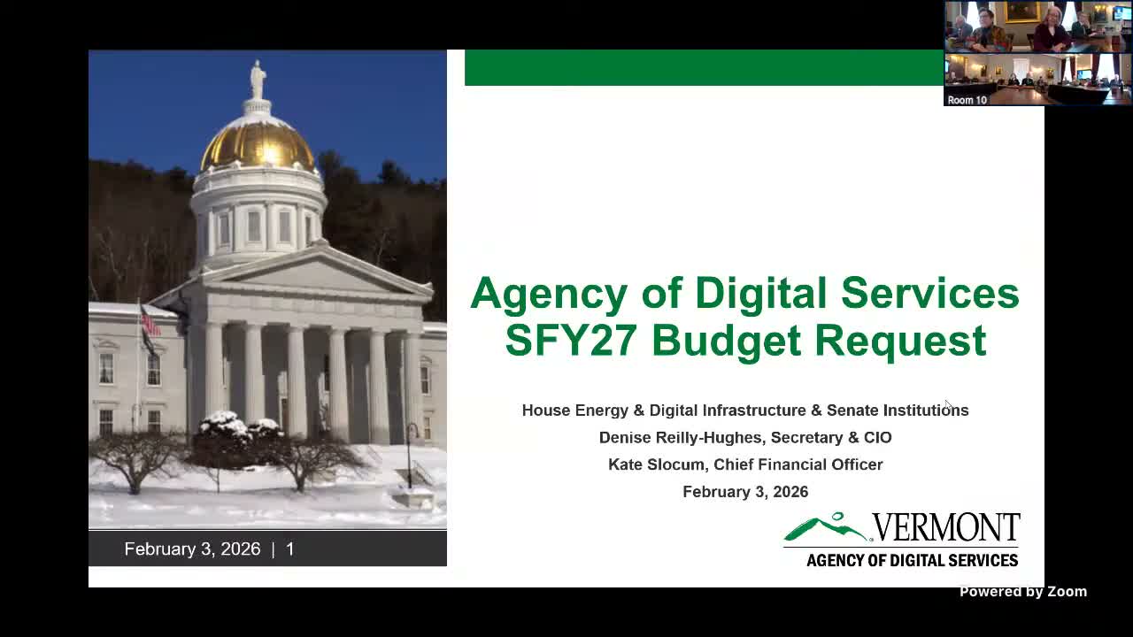 The Agency of Digital Services (ADS) told a joint House–Senate hearing Feb. 3 that the governor’s recommended FY27 budget for ADS totals $96,500,000 and would be presented as two appropriations rather than one. Kate Slocco, chief financial officer for ADS, said the proposal separates foundational “core enterprise services” from demand-driven project spending, with core enterprise services proposed at $49,200,000.