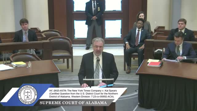 The Supreme Court of Alabama heard argument in The New York Times Company v. Kai Spears on whether Alabama's reporter shield statute protects information that would reasonably identify a confidential source and whether that protection extends to a newspaper published both in print and online. Chad Bowman, arguing for the Times, said Alabama's statute was enacted to encourage sources and that courts should protect not only names but documents and other details that would "reasonably identify" a confidential source.