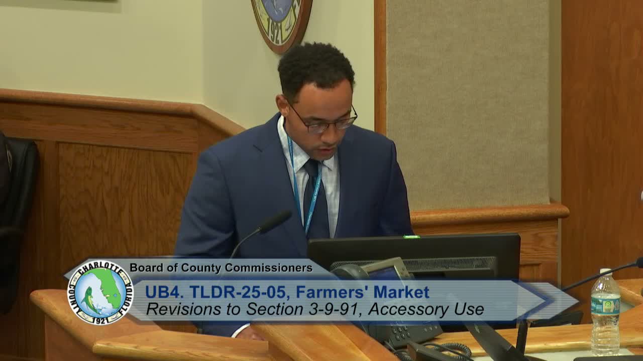 Charlotte County amended zoning code Jan. 27 to allow farmers markets as accessory uses in any zoning district, expanding from a short list of previously eligible districts. The change keeps existing conditions — the market must be accessory to an existing primary use, vendors must be permitted and local permitting remains an annual process — but removes a zoning‑district restriction so communities may apply in more locations.