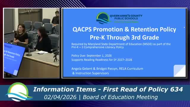 The Queen Anne's County Board of Education received a first read of a promotion and retention policy for preK through third grade that aligns with the Maryland State Department of Education’s comprehensive literacy guidance.