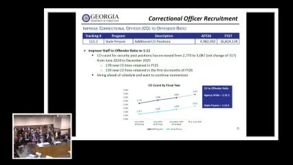 The Georgia Department of Corrections told the Senate appropriations subcommittee that funding in the governor’s amended budget is aimed at moving toward a 1:11 correction‑officer ratio used as a benchmark by Guidehouse. DOC said it does not seek new state slots but wants to fully fund existing filled positions and account for anticipated promotions and step increases.