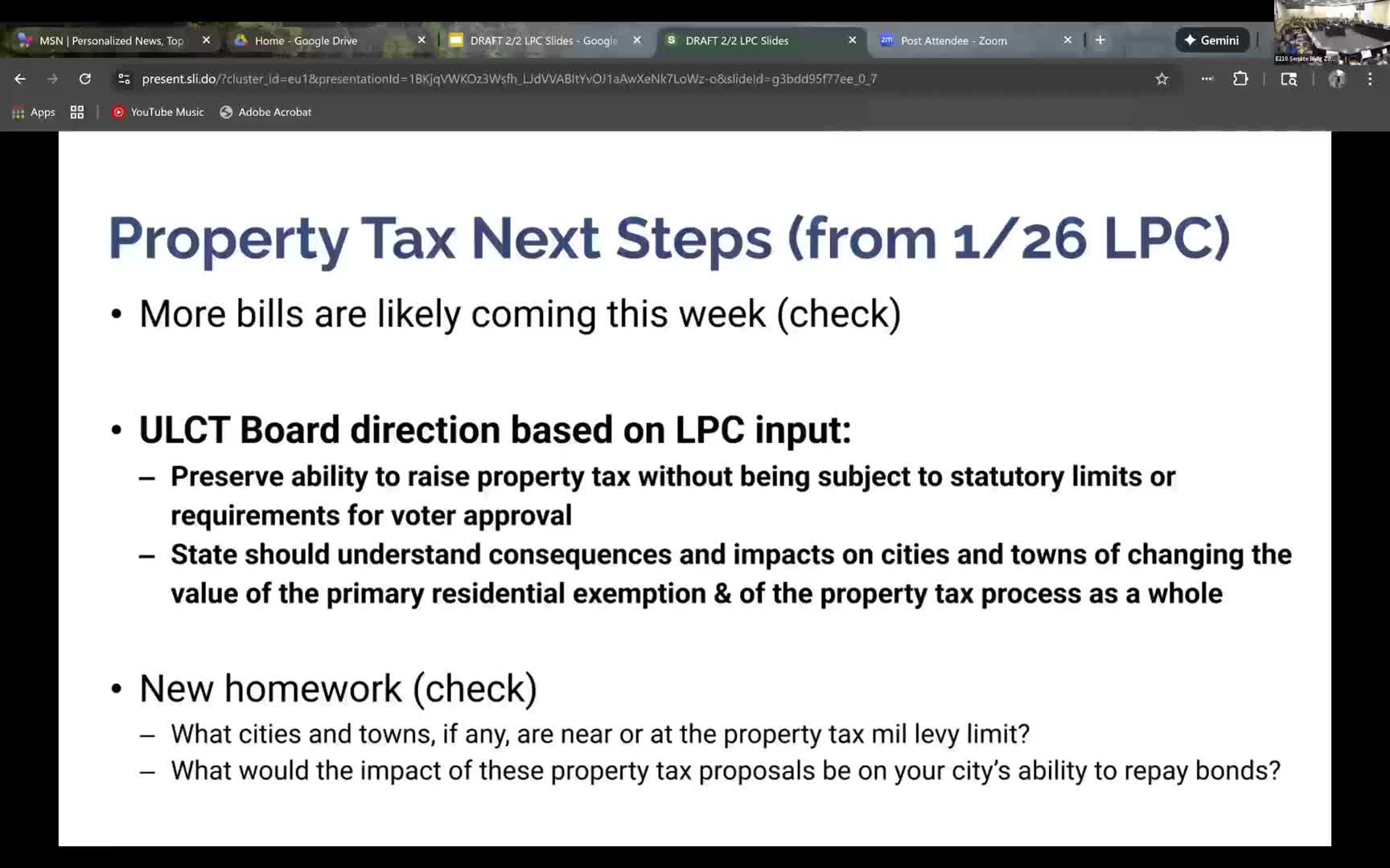 Next steps: the League requested members return technical responses by the stated deadline and indicated it will relay Slido results and member feedback to legislators as bills evolve. The committee did not take any formal legislative positions during this meeting.