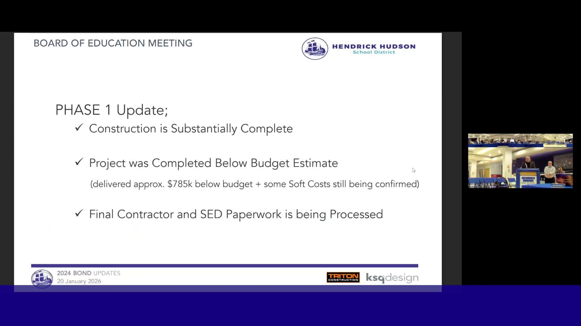 Armand Codrani of KSQ said construction for phase 1 is substantially complete and the team 'came in significantly below budget' for that phase; staff and KSQ are reviewing soft‑cost underspends for potential transfer into phase 2 work. He said the team is within a narrow margin—"within 3% of budget"—for phase 2, and that alternates will be used depending on market conditions.