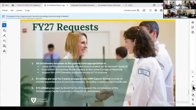 University of Vermont President Marlene Trump told the Senate Appropriations Committee she is asking the state for a 3% inflationary increase to the general fund appropriation, a five‑year $1 million/year commitment for the UVM Cancer Center, and support toward completing a multipurpose center with remaining costs the university placed at about $101 million.
