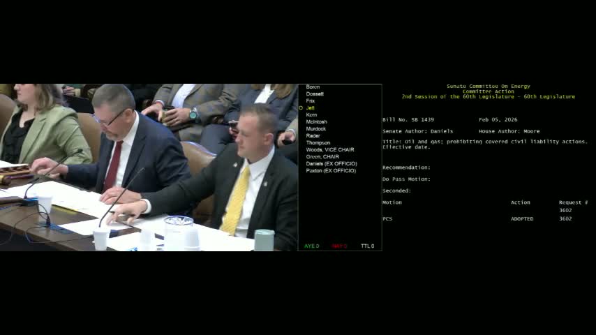 Senator Daniels presented the Energy Security and Independence Act (Senate Bill 14 39), saying the bill is intended to address what she described as an increase in "climate lawfare" in other states and to protect companies in the fossil-fuel sector that are operating within permits and regulatory requirements. Daniels said the bill does not protect unlawful actors and that it focuses on claims alleging climate-change damages rather than violations of environmental or worker-safety laws.