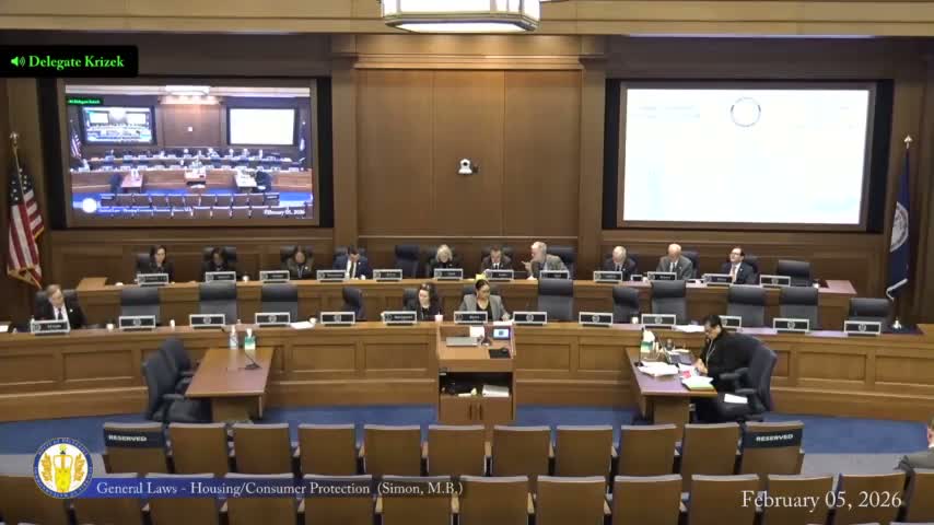 Several bills addressing manufactured-home communities and tenant fees dominated later docket items. Delegate Kriz (and others) presented measures to require upfront disclosure of lot-rental fees, restrict certain fee shifts from owners to tenants, and to give residents a right of first refusal when parks are sold.