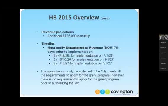 Staff explained House Bill 2015 would allow a 0.1% (one‑tenth of 1%) local sales tax dedicated to criminal justice purposes that the city could keep entirely rather than share with the county. Staff said revenue projections varied with the city’s tax base but that initial estimates were in the range of several hundred thousand dollars annually; staff also noted the state offered a one‑time grant program that could contribute up to $125,000 toward a newly created officer’s first‑year cost, through June 30, 2028, but cautioned that the grant was limited and not a reliable long‑term funding source.