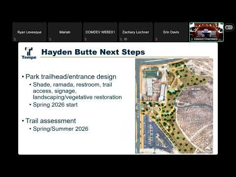 Hayden Butte, Cortese said, is listed in the National Register of Historic Places and is monitored for erosion and rock movement; the 2025 preserve management plan will guide priorities. Cortese described plans to pursue a Mill Avenue trailhead connection, a full trail assessment this year, erosion control, vegetation restoration, and options to preserve petroglyphs. “We are currently working with a trail contractor… to perform an assessment and a plan for trail improvements to address erosion,” he said.