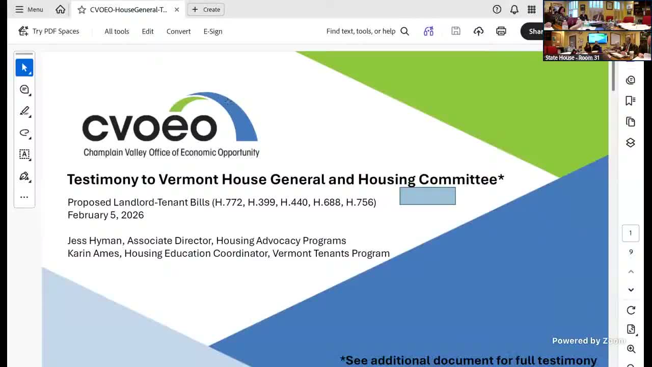 Witnesses at the House Devlin Finance hearing split along familiar lines: Champlain Valley Office of Economic Opportunity urged against shortening eviction notice periods and pushed for rental registries, right to counsel and capacity funding; the Vermont Landlords Association urged streamlining to reduce lengthy court backlogs.