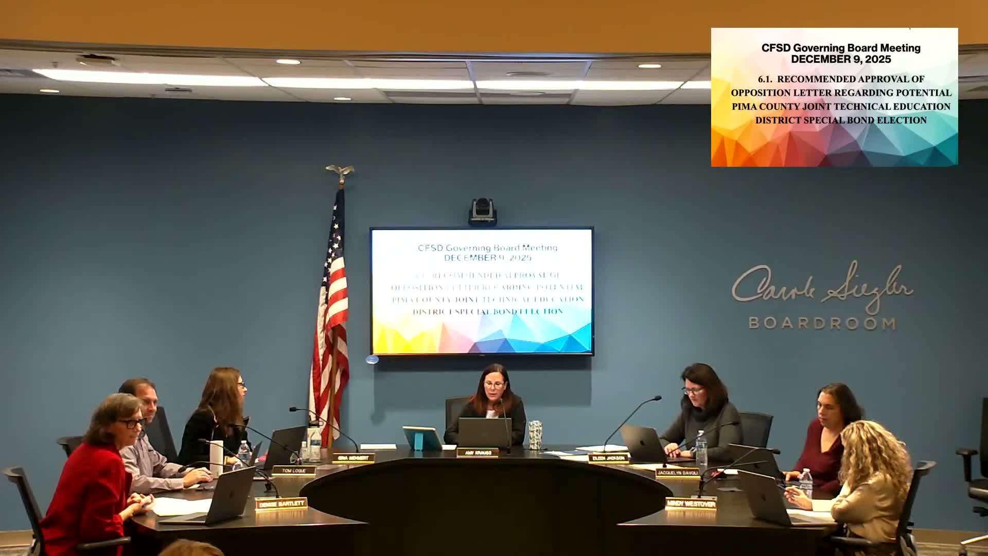 The Catalina Foothills Unified School District governing board voted 5–0 to sign a letter opposing the current draft of a proposed Pima County Joint Technical Education District special bond election, citing concerns that the plan would concentrate most capital spending at central campuses while shortchanging satellite programs that serve the majority of students. The motion approved on the board floor said the letter opposes the "current draft" of a potential bond slated for November 2026 and left open the possibility of reconsideration if new, substantive information is provided.