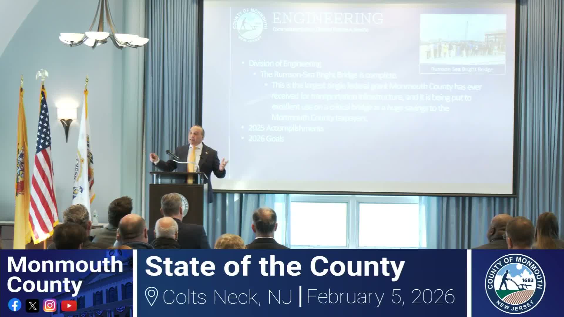 In the State of the County address, Commissioner Director Tom Arnone described the Oceanic Bridge as a signature transportation project for Monmouth County and said the county is in design planning and pursuing outside funding.