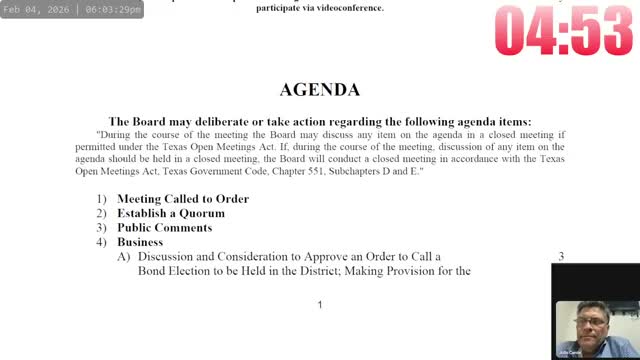 The Sharyland Independent School District board voted unanimously to approve an order calling a $250,000,000 bond election after public comment supporting facility repairs and a proposed district natatorium.