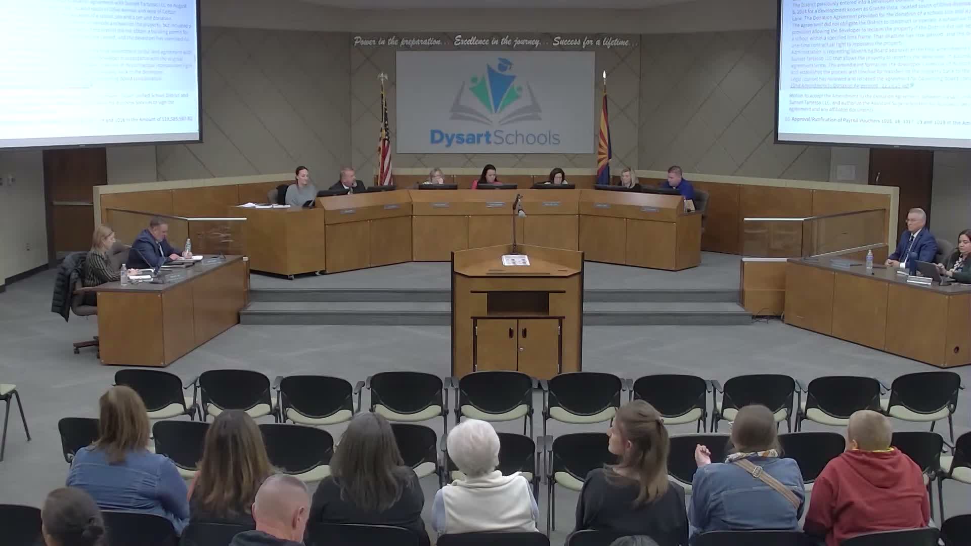 Board members discussed and approved an amendment to a donation agreement between Dysart Unified School District and Sunset Tartesso LLC concerning an undeveloped parcel that the district received as a conditional donation in 2014.