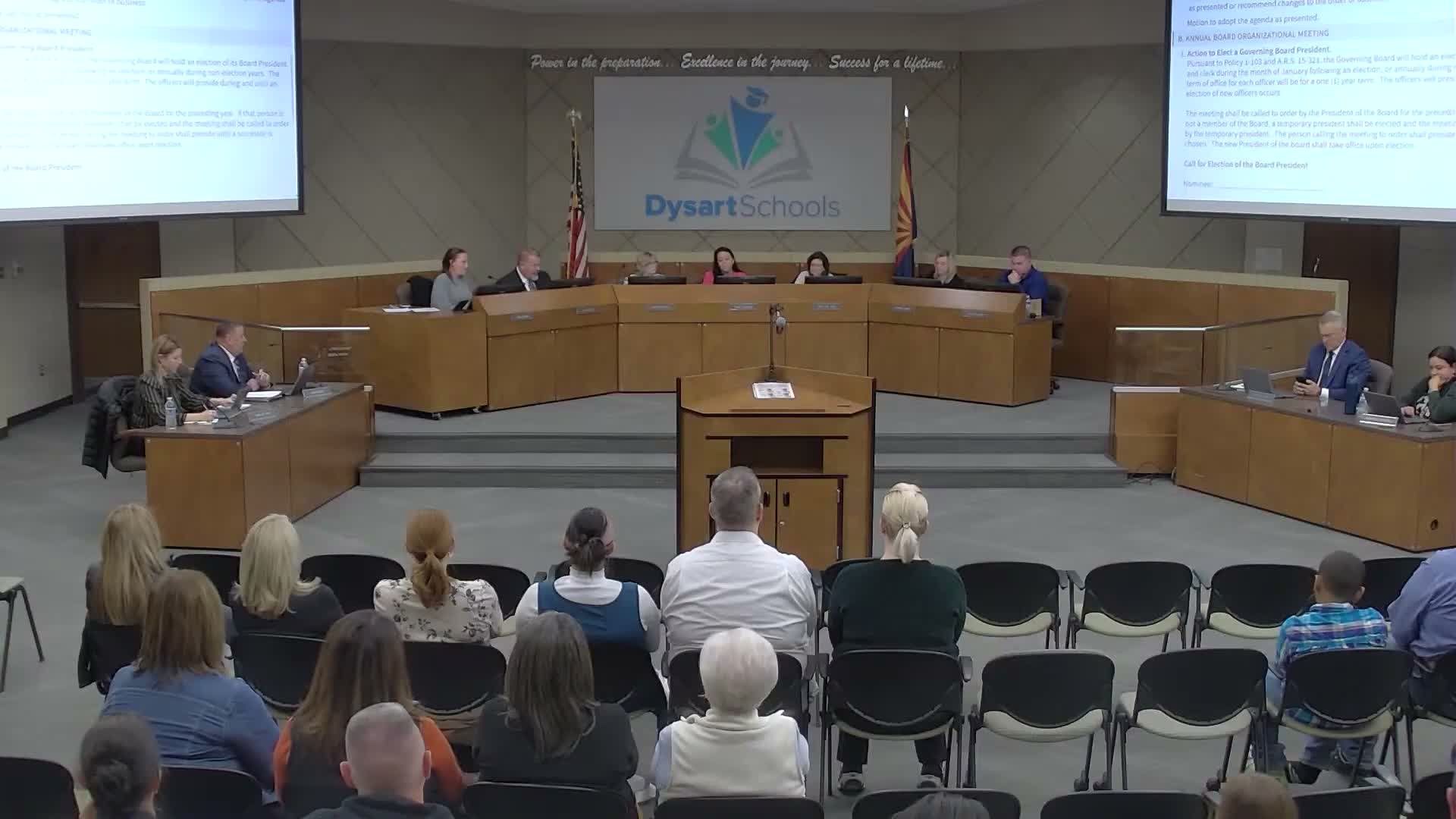 The Dysart Governing Board elected Steve Scarvera as board president and Mary Jane Ziola as board clerk. A proposal to move policy monitoring from an annual to a three-year rotation failed after members voiced concerns about reduced oversight.