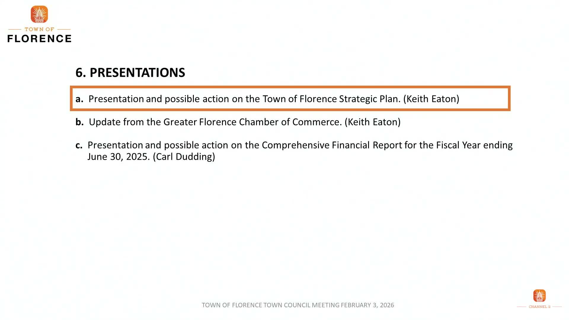 Florence — The Florence Town Council unanimously approved a five‑year strategic plan on Feb. 3, 2026, adopting a framework that sets the town’s vision, mission, core values and four high‑level goal areas: reliable infrastructure; economic development and vitality; cultivating a high‑performance government; and strengthening community character and sense of place.