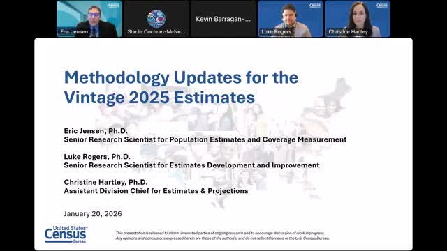 "Today I'm going to be talking about methodology updates for the vintage 2025 estimates," Eric Jensen, senior research scientist for population estimates and coverage measurement, said during a public webinar previewing the release. Jensen said the Vintage 2025 release will cover the period from April 1, 2020, through July 1, 2025, and will include an updated time series of annual July 1 population values.