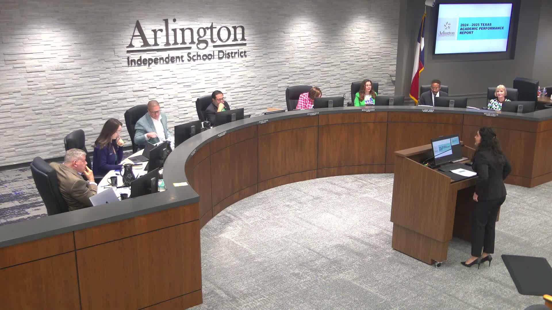 Arlington ISD presented its 2024'25 Texas Academic Performance Report (TAPR) during a public hearing on Feb. 5. Dr. Lopez highlighted district testing and postsecondary outcomes and opened the hearing for comment, which closed with no public speakers.