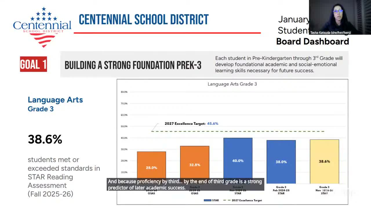 Dr. Katsuda, presenting the report, said 38.6% of third-grade students met reading standards on the fall STAR assessment and set a year-end target of at least 42% to remain on track for the district's 2027 excellence goals. "This level of performance is below what is needed to meet our Roadmap '27 goals," Dr. Katsuda said. She added the district's improvement strategy focuses on "strengthening core instruction" and more effective use of professional learning communities (PLCs).