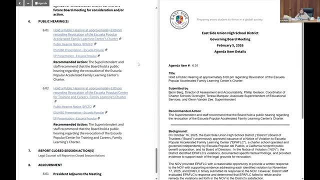 SAN JOSE — The East Side Union High School District Board of Trustees on Feb. 5 held a public hearing on whether to revoke the charters for two Escuela Popular schools, hearing competing presentations from district oversight staff and Escuela Popular leaders and taking dozens of community speakers before adjourning with no action. The board scheduled a final decision for a special meeting on March 5.