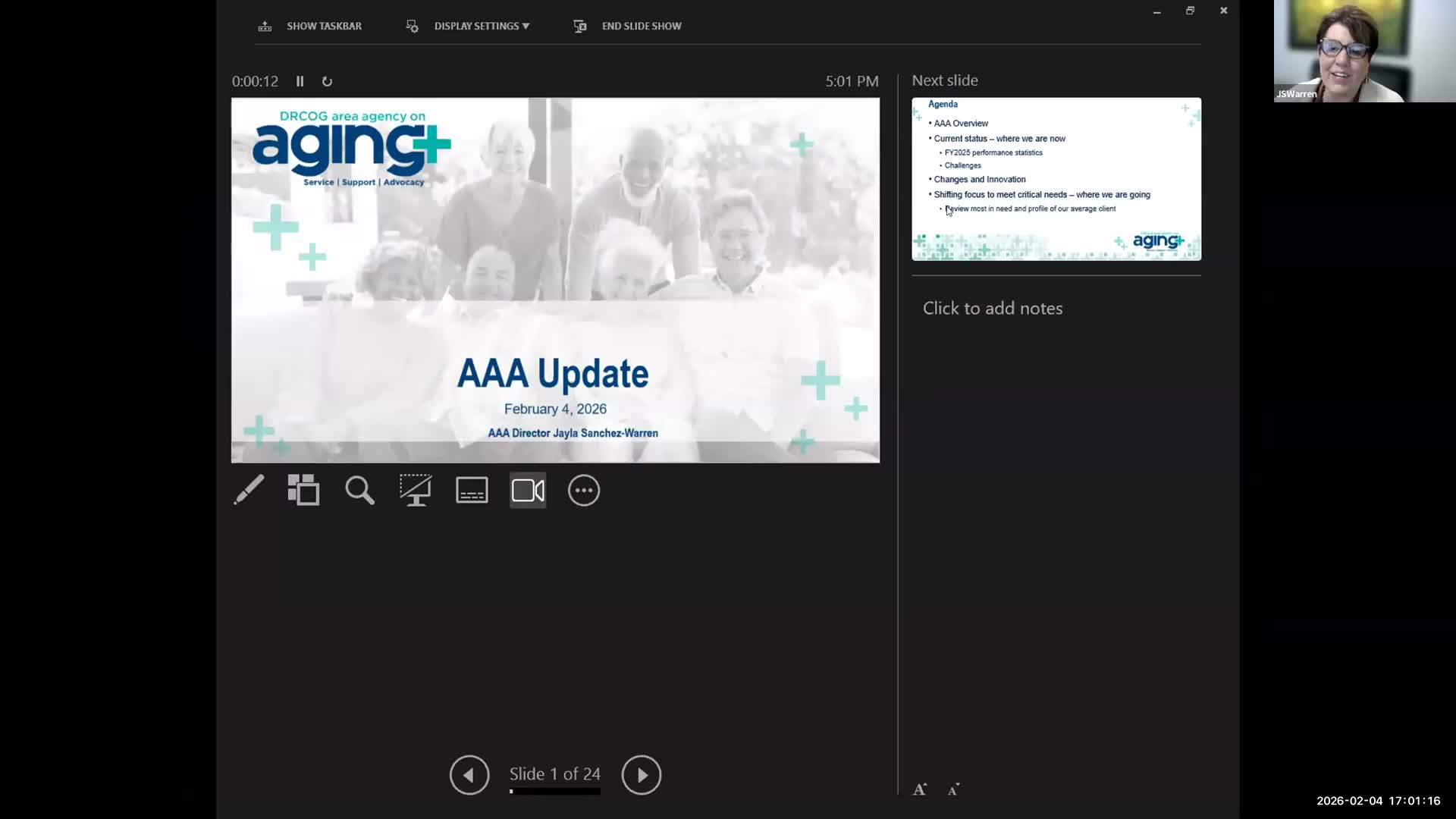 Jayla, the AAA lead who addressed the board, said the agency — which DRCOG has served as designated Area Agency on Aging for more than 50 years under the Older Americans Act — recorded funding declines of about 20–21% in fiscal 2025. "We've lost $8,000,000 just in DRCOG's area agency on aging in the last 2 years," she told the board, and described the result as dramatic adjustments to continue serving rising demand.