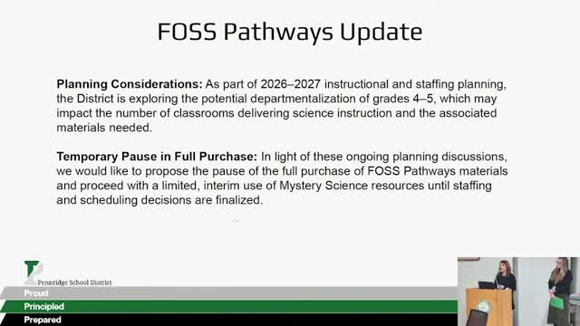 Pennridge School District staff told the curriculum committee they remain committed to FOSS Pathways as the district’s chosen 3–5 science curriculum but recommended postponing full material purchases while the district evaluates elementary departmentalization models that could reduce the number of classroom kits needed.
