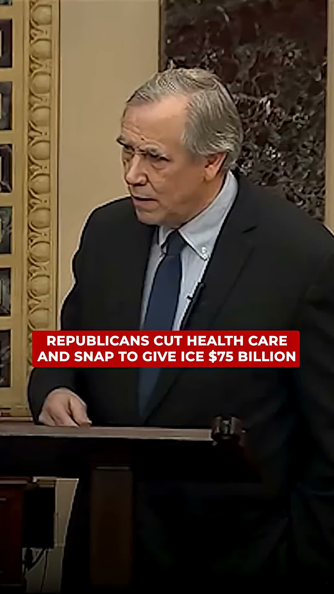 An unidentified speaker urged the Senate to withhold further funding for U.S. Immigration and Customs Enforcement (ICE), criticizing a prior federal spending measure he described as a "big beautiful bill" that reduced nutrition and health benefits while allocating $75,000,000,000 to ICE.