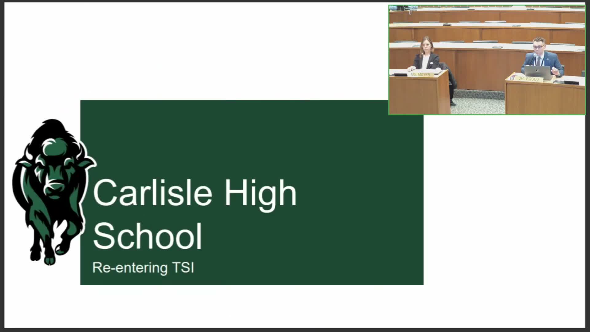 The TSI re‑identification for Carlisle High School is informational at this committee meeting; administrators said they will return to the board in July/August with the formal improvement plan required by the state. No board vote was taken at this time.