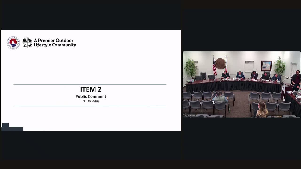 Votes at a glance - Approval of Dec. 15, 2025 minutes: motion by Bill, second by Ben; passed unanimously. - Acceptance of $150,000 Texas Parks & Wildlife directed grant for Town Center Park (donor garden and restroom): motion by Joe, second by David; passed unanimously. - Approval of Veterans Memorial on donated or city-owned land (flexibility to change site while fundraising): motion by Joe, second by Bill; passed unanimously. - Approval of 51-foot sailboat northern entry monument concept: motion by Bill, second by Ben; passed unanimously. - Adoption of Parks & Trails and City of Heath donation policy: motion by Veil, second by David; passed unanimously. - Approval of Town Center Park donor-pricing/menu: motion by Ben, second by Joe; passed unanimously. - Approval of PATH outfield fence project and associated PATH fund allocation: motion by Bill, second by Ben; passed unanimously.