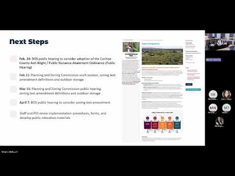 The next formal step is a board public hearing to consider adoption of the ordinance; staff said they will prepare the text amendment for outdoor storage and bring zoning updates to the Planning and Zoning Commission before returning to the board. No formal vote or ordinance adoption occurred at the Feb. 5 work session.