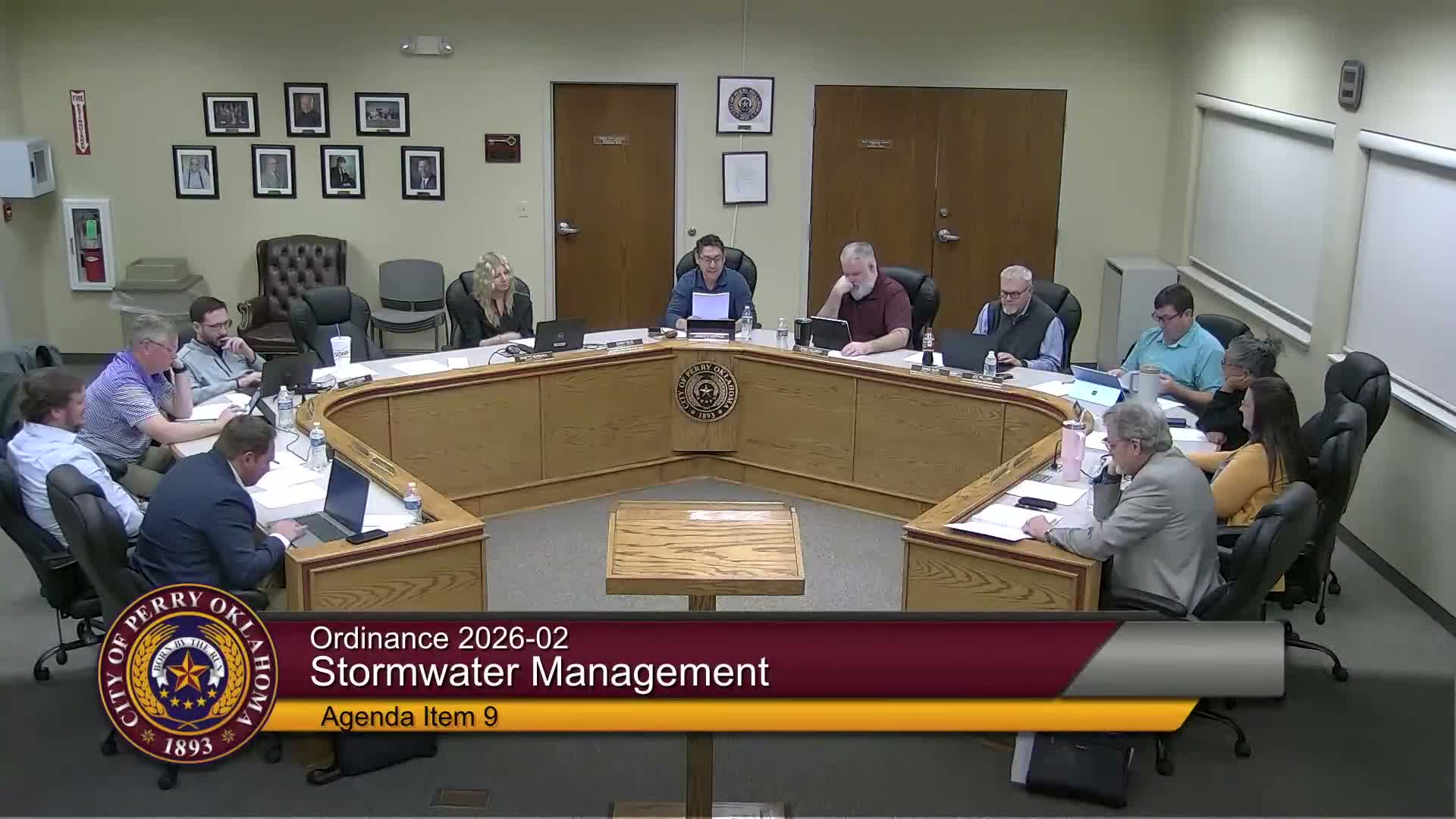 The Perry City Council adopted an emergency stormwater ordinance (Ordinance No. 2026‑2) requiring one‑time impact fees for new development, preserving the existing $3 monthly drainage charge for current customers, and establishing local drainage design standards; the emergency clause was also approved.
