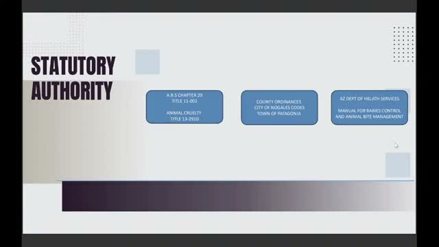 Animal-control manager Jose Pena (on the record) explained relevant legal authority (county ordinance and Arizona Revised Statutes referenced during the presentation) and said county code requires animals to be contained on private property unless they are in a fully fenced enclosure. In public spaces a leash no longer than six feet is required; the county allows a ten‑foot minimum tie‑out on private property only under specific conditions. "If we don't know they're out there, we can't solve that problem," Pena told the board, urging residents to file complaints.