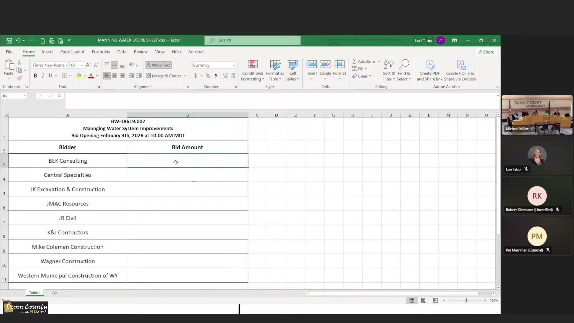 Dunn County commissioners awarded the Manning Water System Improvements contract to JK Excavation and Construction for $1,500,300 after a public bid opening and staff review.