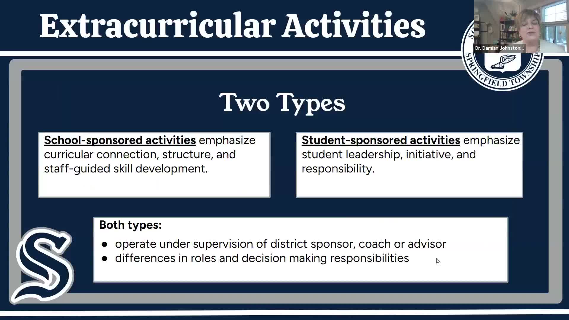 "There are two types of extracurricular activities that we're gonna talk about. School sponsored activities and student sponsored activities," Doctor Johnson told the committee, framing the central distinction. She added that "school sponsored activities are ones that are created on behalf of the school district," which are funded through the district budget and supported with district transportation, materials and staffing.