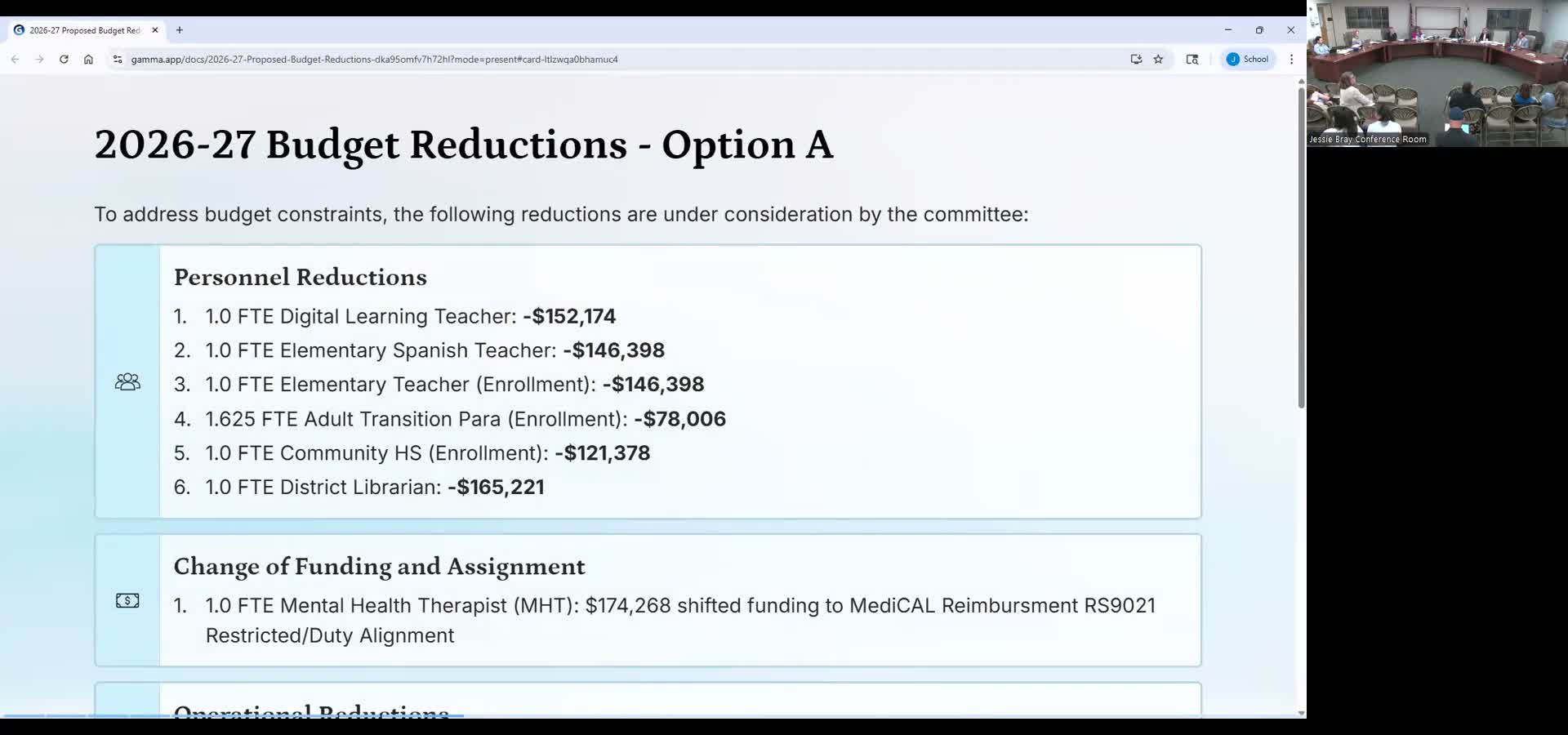 District staff presented two reduction packages to close a projected 2026–27 shortfall, proposing elimination or reclassification of several certificated roles. The proposals drew sustained public comment urging protections for student-facing roles, and trustees requested further district-office staffing analysis before final action.
