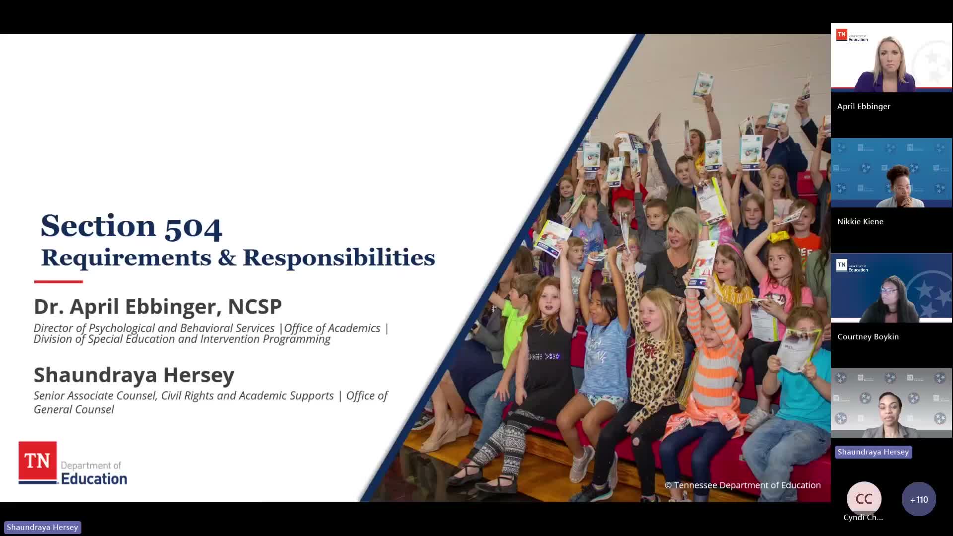 Shondrea Hirsi, Assistant Counsel for Civil Rights and Academic Support at the Tennessee Department of Education, and April Evinger, the department's director of psychological and behavioral services, led a statewide webinar for local education agencies on Section 504 compliance and practice.