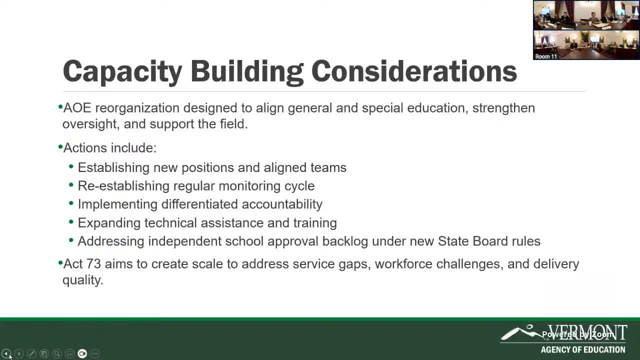 Secretary Zoe Saunders described organizational changes, a playbook and toolkit for Act 173 implementation, boot‑camp training and regional coaching, and said the agency commissioned a separate study (with Joint Fiscal Office coordination) to evaluate conditions for moving to the Act 73 weighted funding model, cautioning about federal MOE/MFS constraints.
