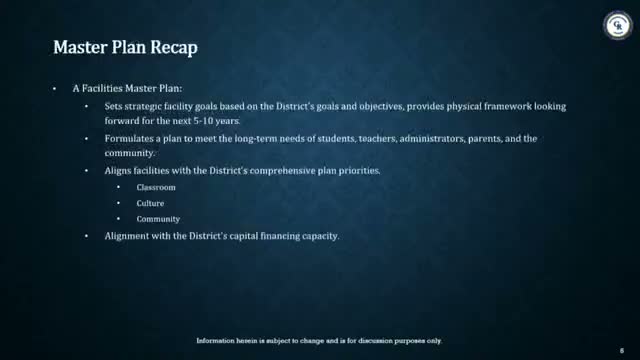 The Facilities Committee reviewed a recap of the district’s facilities master plan and enrollment projections, with staff and consultants presenting operating and functional capacity figures and a multi‑year project schedule.