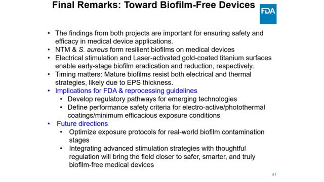 Her regulatory recommendations were pragmatic: develop standardized performance metrics for anti‑biofilm technologies, require realistic contamination and reprocessing challenge models in testing, assess potential corrosion or materials‑compatibility issues (especially for electrochemical approaches), and evaluate tissue‑safety when heating or nanomaterials are used. She also highlighted collaboration with other FDA centers and external partners and acknowledged Office of the Chief Scientist grant support.