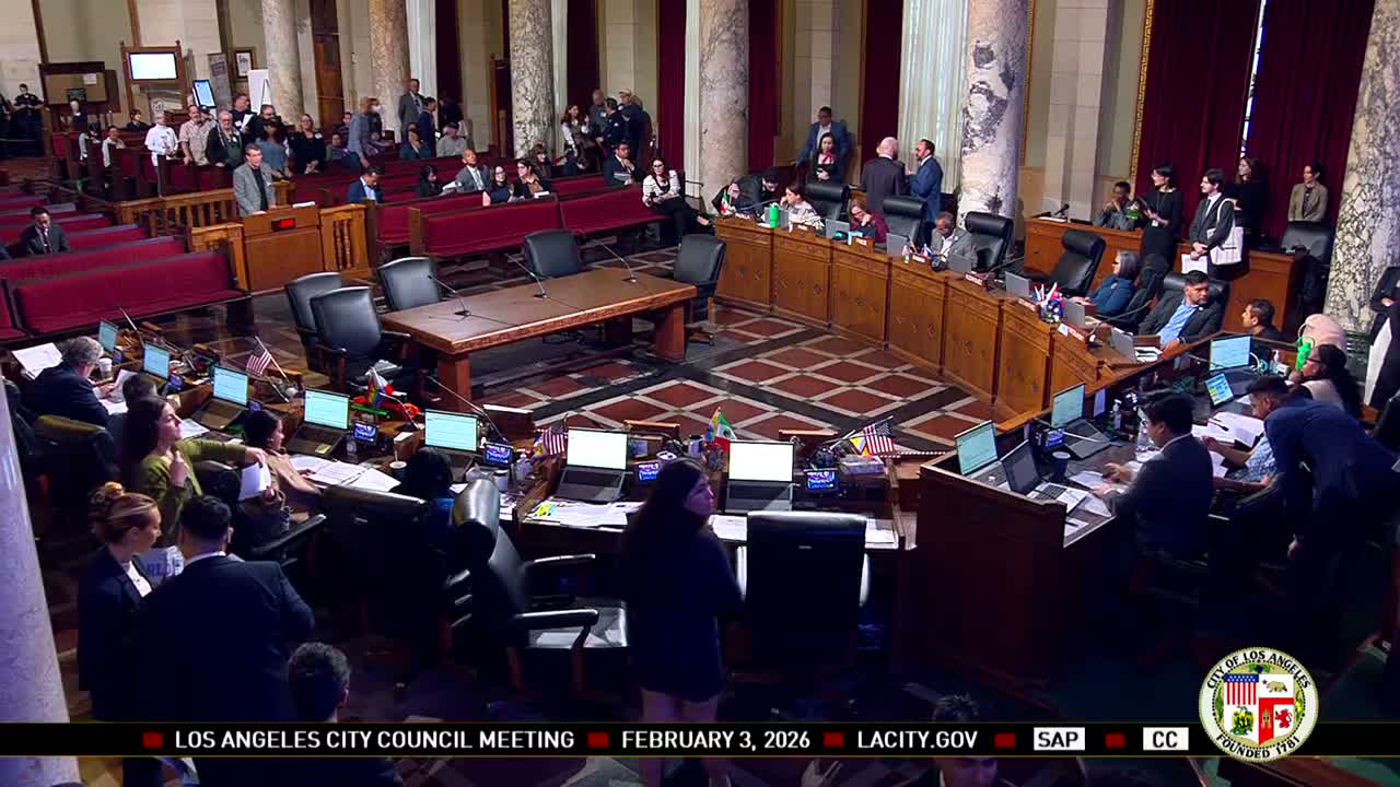 Hundreds of Palisades fire survivors and residents urged the Los Angeles City Council to waive plan and permit fees after the January fire, and the council agreed to send item 30 'forthwith' for expedited consideration. Final approval of waivers was not recorded in the transcript.